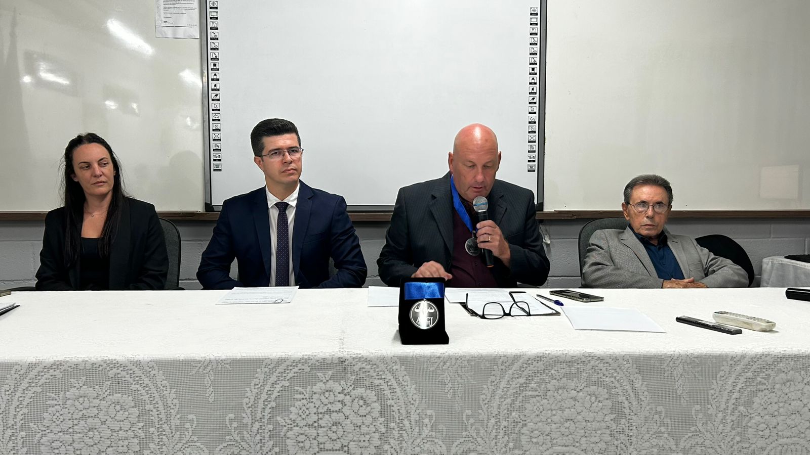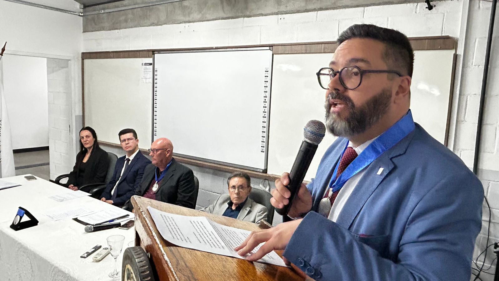 A saudação ao novo acadêmico foi proferida pelo professor Paulo Afonso de Oliveira Júnior, enquanto o currículo foi apresentado pelo delegado de Polícia Saulo do Prado.